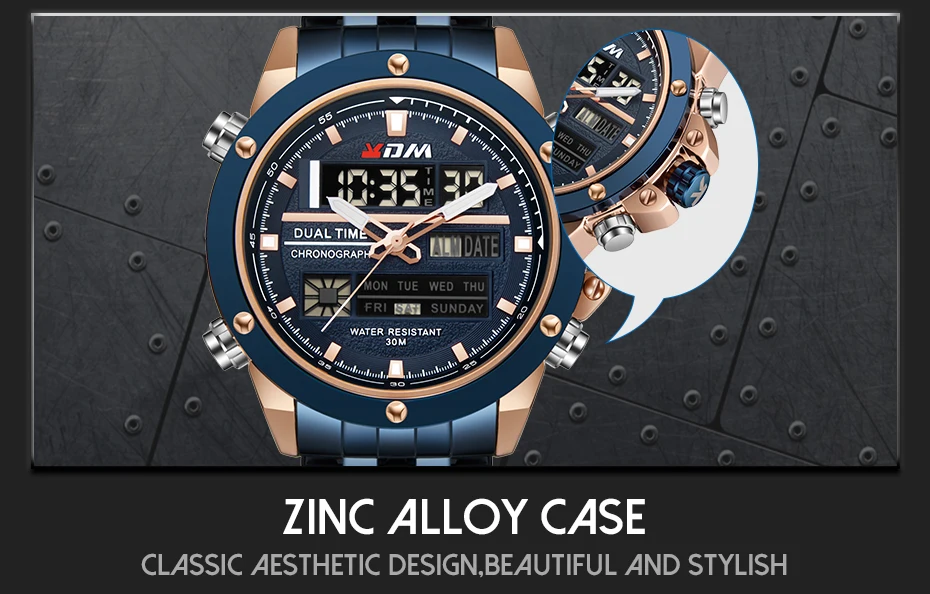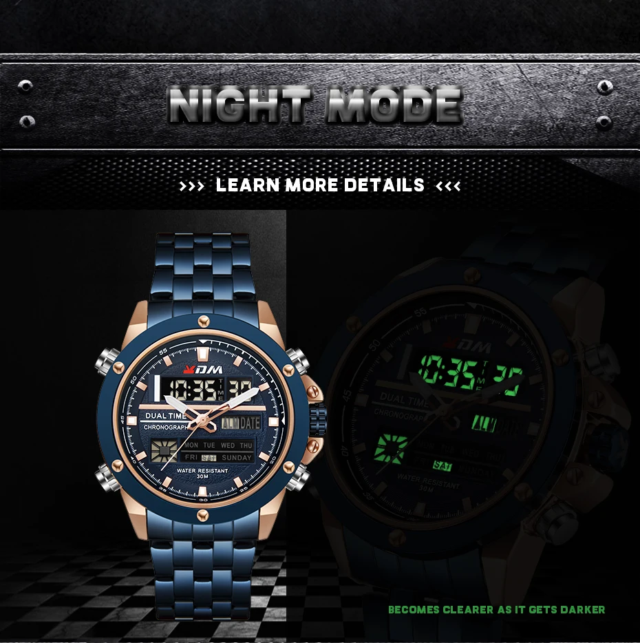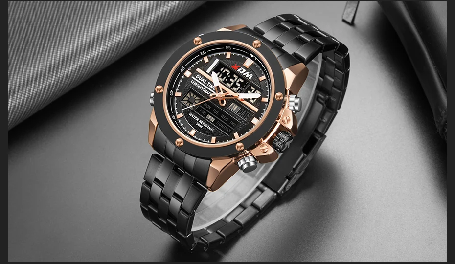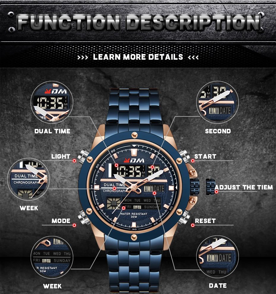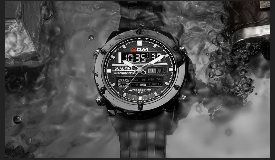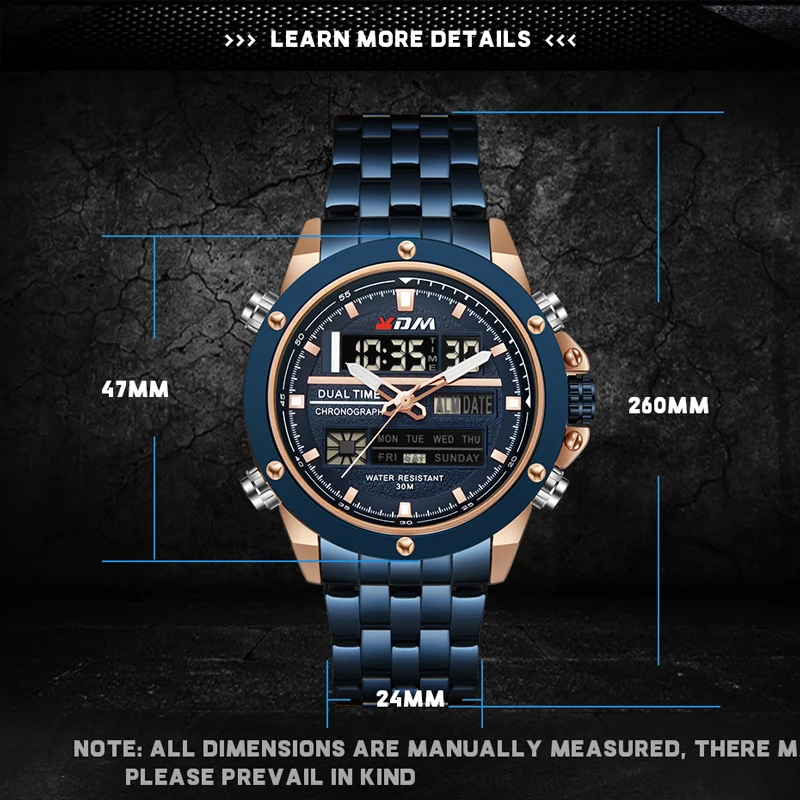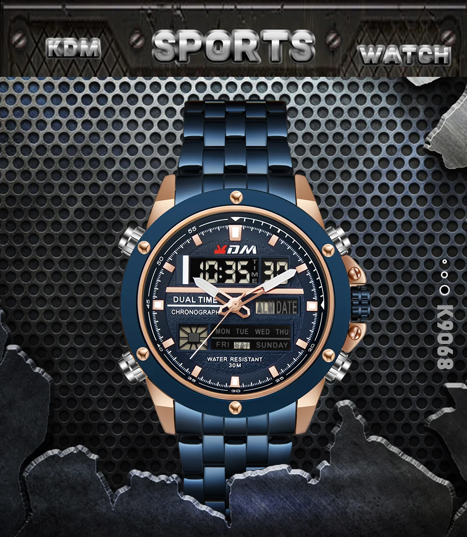 1. Brand: KDM2. Dual time shows with LED backlight function3. 30M Water Resistant4. Type: Men Sports Watches5. Movement: Japan Original Digital Movement6. There are 6 colors for selection8. Band Width: (approx) 2.4cm9. Dial Diameter: (approx) 4.7cm10. Strap Material: Stainless steel11. Case Material: Alloy + High Strength Hardened Glass12. Clasp: Buckle13. Showing precise time14. It is good gift for someone specialNote: we suggest you not wear it when swim .but if you go to swim or dive , pls don't press any button underwater!Components Included