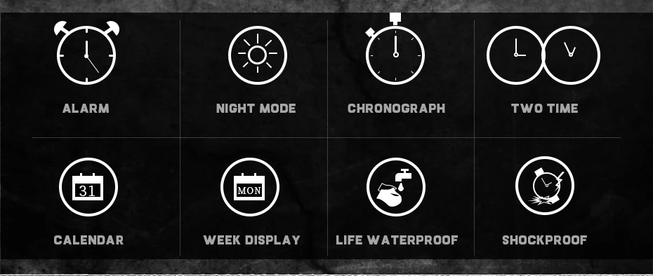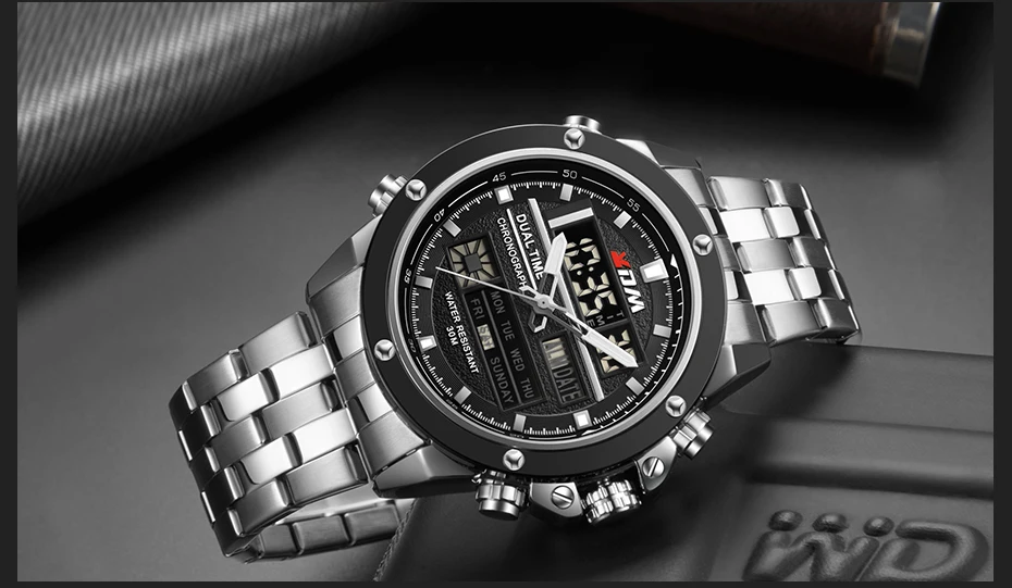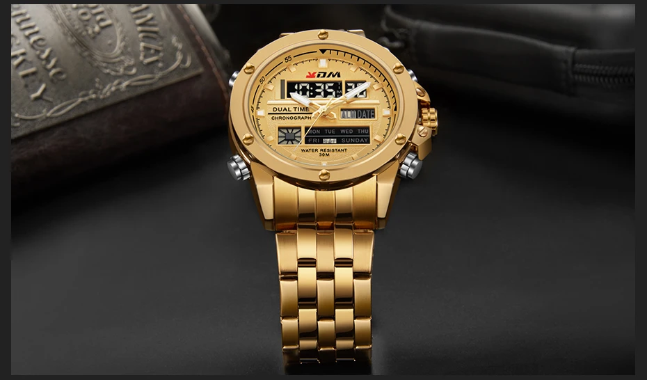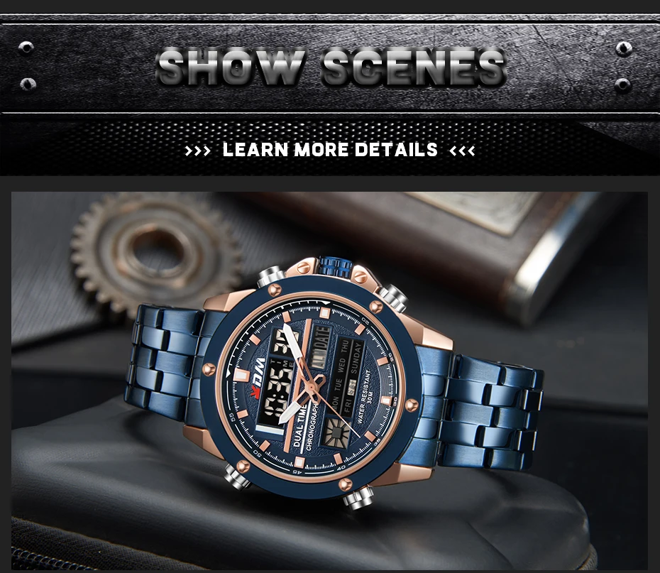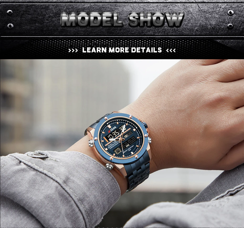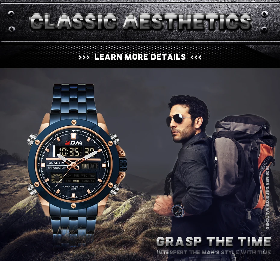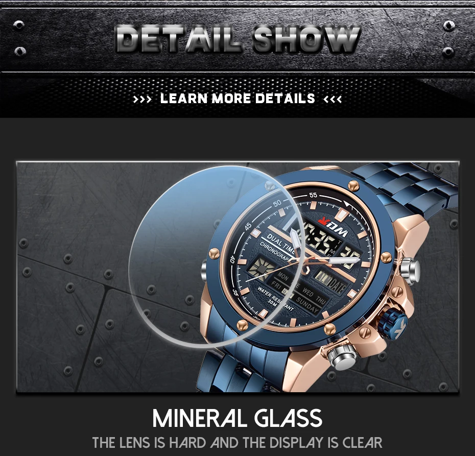 1. Brand: KDM2. Dual time shows with LED backlight function3. 30M Water Resistant4. Type: Men Sports Watches5. Movement: Japan Original Digital Movement6. There are 6 colors for selection8. Band Width: (approx) 2.4cm9. Dial Diameter: (approx) 4.7cm10. Strap Material: Stainless steel11. Case Material: Alloy + High Strength Hardened Glass12. Clasp: Buckle13. Showing precise time14. It is good gift for someone specialNote: we suggest you not wear it when swim .but if you go to swim or dive , pls don't press any button underwater!Components Included