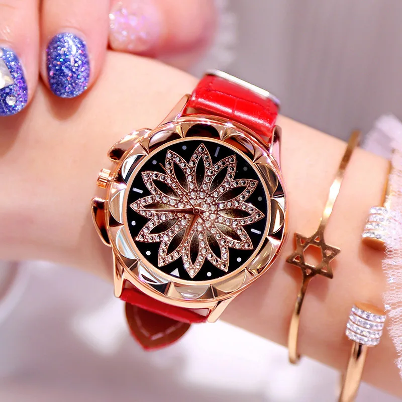 | 1PCs Rhinestone Women Quartz Watches Ladies Watch Leather Big Dial Crystal Diamond Flower Clock Fashion Bracelet Wrist Watch |