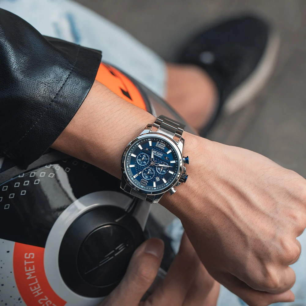 MEGIR Men's Quartz Wrist Watch Men Stainless Steel Band Chronograph Mens Watches Luminous Waterproof Men Quartz Wristwatches