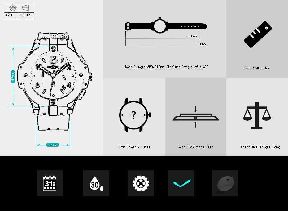 Water Resistant 3ATM , Luminous Hands, Multifunctional timer, Calendar