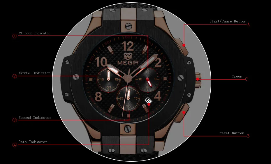 Chronograph Indicator: three time keeping indicator:24-hour Indicator, second, minute